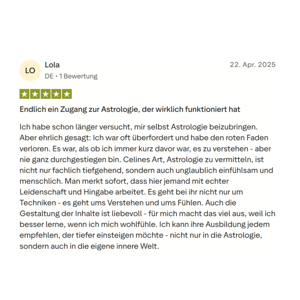Bei Lola hat sich durch die Arbeit mit Astrologie sehr viel gezeigt. Sie hat Dinge über sich erkannt, die stark mit ihren eigenen Schattenthemen verbunden sind und die sie vorher nicht greifen konnte. Genau diese Erkenntnisse haben sie tiefer zu sich selbst geführt.