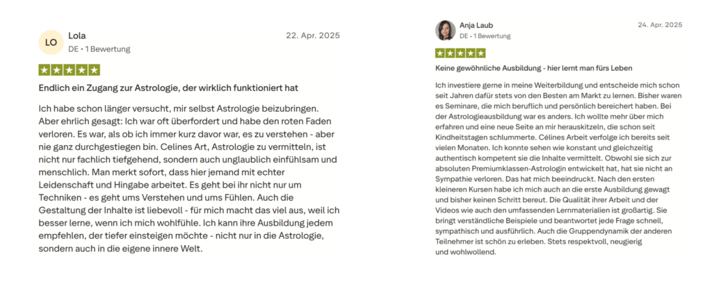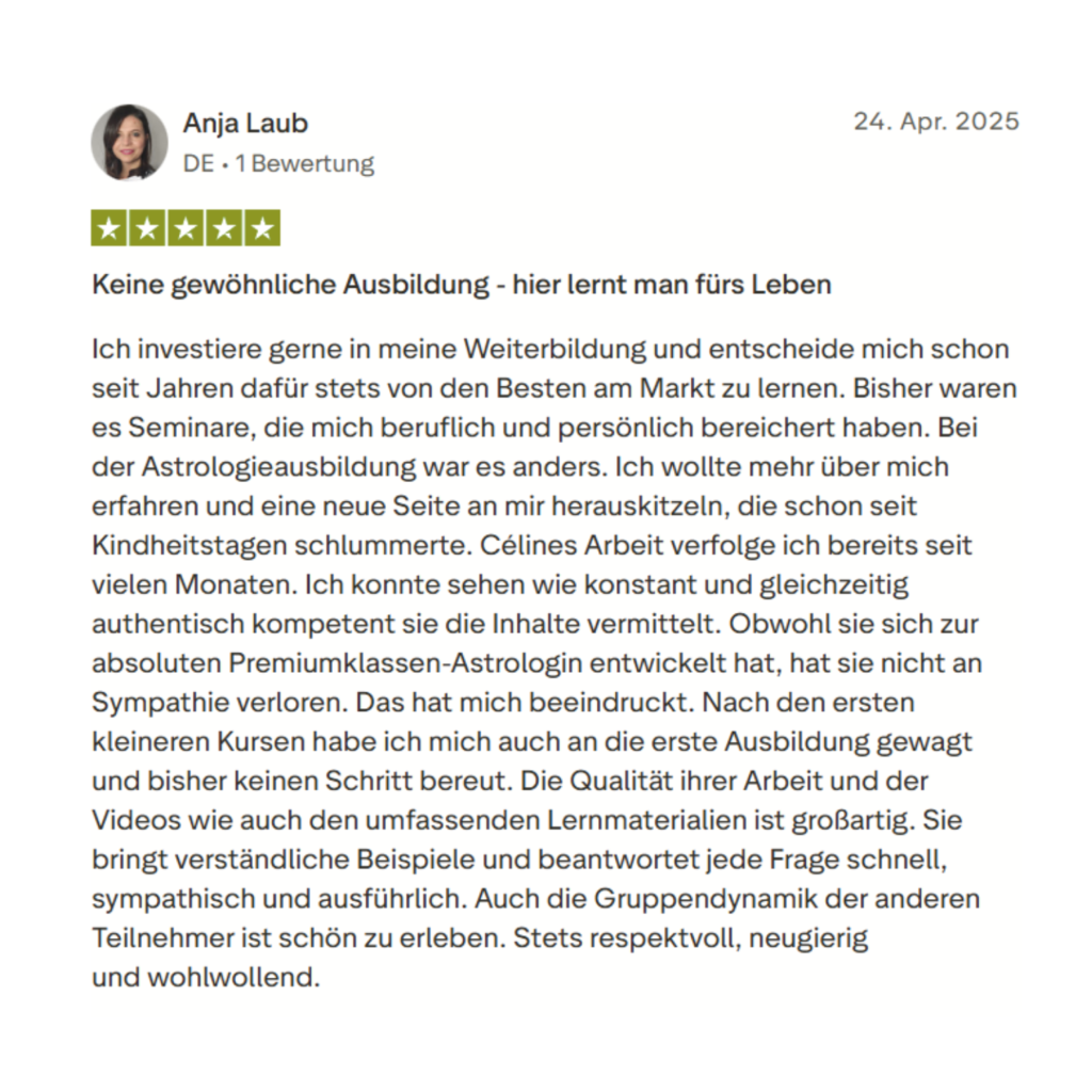 Über 6.000 Kundinnen haben bereits mit meinen Kursen gelernt. Viele von ihnen arbeiten heute professionell als Astrologinnen.